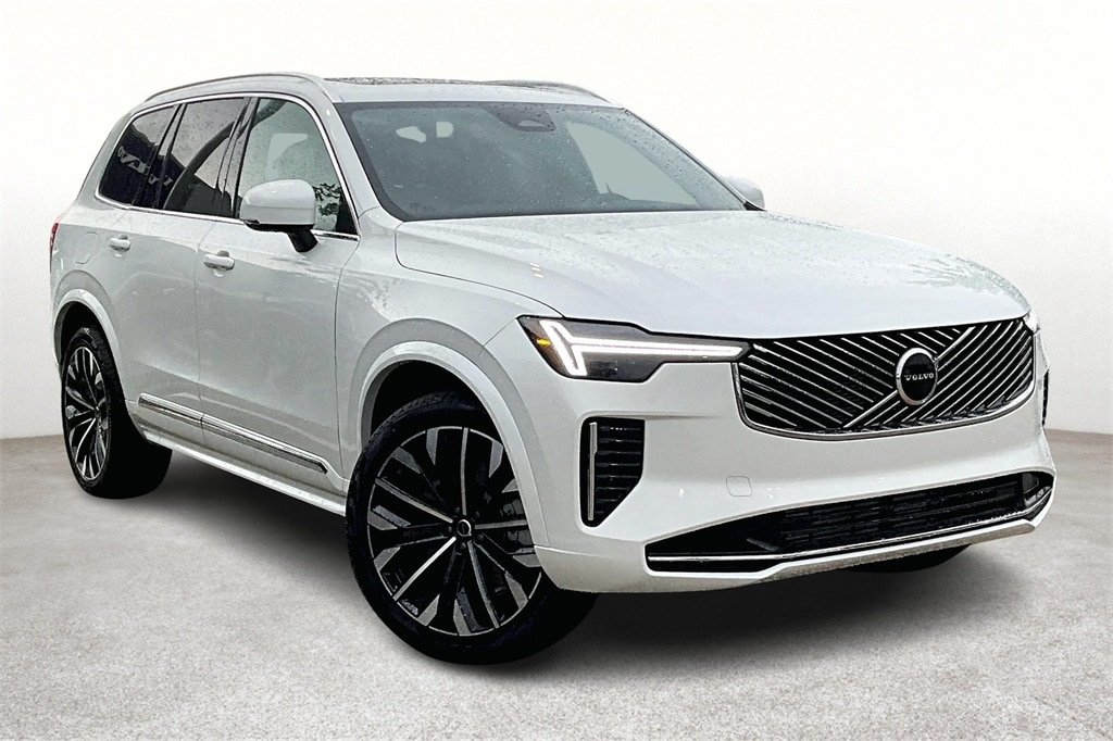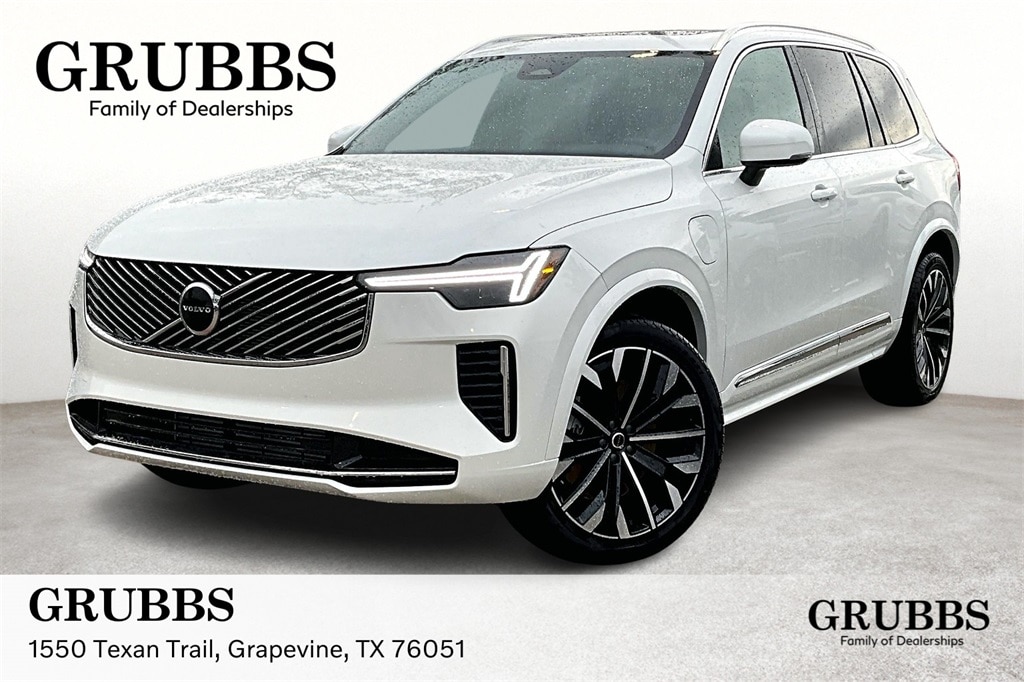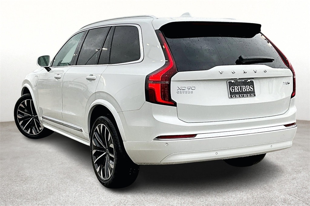 White 2025 Volvo XC90 Plug-In Hybrid T8 Core 7 Passenger 2025.5 AWD Automatic with Geartronic 2.0L I4 Hybrid Turbocharged DOHC 16V LEV3-SULEV30 2.0L I4 Hybrid Turbocharged DOHC 16V LEV3-SULEV30, 11 Speakers, 3rd row seats: bucket, 4-Wheel Disc Brakes, ABS brakes, Air Conditioning, Alloy wheels, AM/FM radio: SiriusXM, Anti-whiplash front head restraints, Apple CarPlay, Auto High-beam Headlights, Auto-dimming door mirrors, Auto-dimming Rear-View mirror, Automatic temperature control, Brake assist, Bumpers: body-color, Delay-off headlights, Driver door bin, Driver vanity mirror, Dual front impact airbags, Dual front side impact airbags, Electronic Stability Control, Emergency communication system: Volvo Cars App w/4 Year Subscription, Exterior Parking Camera Rear, Four wheel independent suspension, Front anti-roll bar, Front Bucket Seats, Front Center Armrest w/Storage, Front dual zone A/C, Front reading lights, Fully automatic headlights, Garage door transmitter: HomeLink, Genuine wood dashboard insert, Genuine wood door panel insert, Heated door mirrors, Heated Front Bucket Seats, Heated front seats, Illuminated entry, Knee airbag, Low tire pressure warning, Memory seat, Navigation System, Nordico Upholstery, Occupant sensing airbag, Outside temperature display, Overhead airbag, Panic alarm, Passenger door bin, Passenger vanity mirror, Power door mirrors, Power driver seat, Power Liftgate, Power moonroof, Power passenger seat, Power steering, Power windows, Radio data system, Radio: High Performance Audio System, Rear air conditioning, Rear anti-roll bar, Rear dual zone A/C, Rear fog lights, Rear reading lights, Rear seat center armrest, Rear window defroster, Rear window wiper, Remote keyless entry, Security system, Speed control, Speed-sensing steering, Split folding rear seat, Spoiler, Steering wheel mounted audio controls, Tachometer, Telescoping steering wheel, Traction control, Trip computer, Turn signal indicator mirrors, Variably intermittent wipers, and Wheels: 20" 5-Multi Spoke Black Diamond Cut Alloy.
